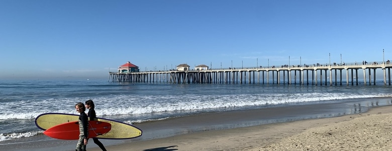 C’est aux californiens que l’on doit également l’invention du skateboard dans les années 1950, le « sidewalk-surfing » était un moyen par absence de vagues de s’amuser et glisser hors de l’eau. Pendant les périodes de sécheresses estivales ils découvrirent que les piscines vides étaient parfaites pour rider et reproduisaient la forme d’une vague. La pratique s’exporta dans les rues à la recherche de terrains opportuns et inspirèrent également la création des « bowl » dans les skates Park. Ces sports créèrent de véritables industries de la glisse. Huntington Beach fut nommé Surf City USA en 1990 et accueille toujours le Vans Open Surf attirant un demi million de spectateurs près du ponton où se déroule la compétition.