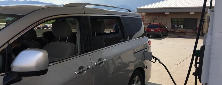 Ce matin, nous quittons Moab direction Monument Valley. Mais comme dans tout voyage, nous allons profiter de la route pour commencer le voyage! Faire le plein de la voiture est déjà toute une aventure qui plait beaucoup à Arthur. Contrairement à tout le reste, l'essence est très bon marché. Pas comme le diesel qui est le plus cher de tous les carburants.