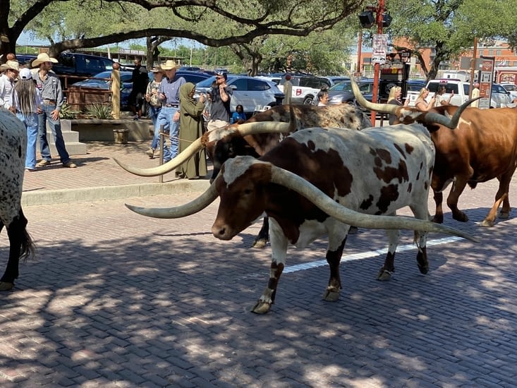 Nous arrivons à Fort Worth Stockyards. C’est un quartier de la ville qui est clairement faite pour le tourisme avec ses restaurants, ses boutiques, des balades à cheval et des long horn qui sont tenus à la longe. Même si à la base c’était l’endroit où les long horn étaient regroupées pour être vendues.