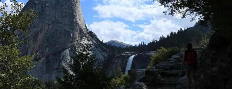 Et ça marche ! Le lendemain matin est lunaire. On n’avait pas vraiment calculé ça, mais le réveil est grandiose : brume et lever de soleil sur les montagnes, avec en prime le bruit assourdissant de la rivière en contrebas. Ulysse nous fat du thé, et on lève le camp à 7h30, tranquillement. On retourne dans Yosemite, on se brosse les dents aux toilettes du visitor center, on prépare une fournée de sandwiches et on file faire une rondo. On a choisi les Nevada Falls, et on n’est pas les seuls. Le début de la marche est un peu laborieux, les randonneurs en tenues fluo se heurtent presque les uns aux autres. Ulysse, qui est loin devant, nous fait prendre un chemin de traverse et on peut continuer à grimper tous seuls. Ça monte, ça monte, mais c’est magnifique : cascades, oiseaux bleus, soleil sur la pierre… Tout en haut, les chutes achèvent de nous impressionner. On s’éloigne un peu pour pique-niquer au bord d’une petite rivière, puis on fait demi-tour en direction du parking. La descente est raide, surtout un passage qui nous fait littéralement passer dans des marches glissantes sous une cascade qui nous trempe jusqu’aux os.