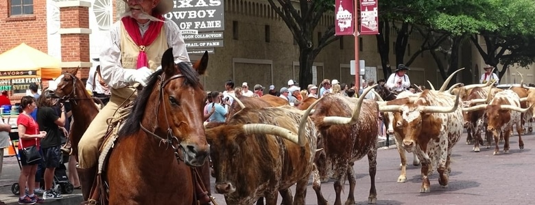 Fort Worth est bel et bien l’antichambre de l’Ouest. Le but de notre visite est de voir les Longhorns, ces énormes vaches dont les cornes sont plus grandes que nous ne sommes hautes. A 11h30, elles sont déplacées d’un enclos à l’autre par une petite troupe de cowboys dont on ne sait pas si les costumes sont là pour faire joli ou pas. Le tout dans le décor pittoresque des stockyards : une rue centrale pavée, des étables gigantesques, des échoppes en bois comme on n’en voit que chez Sergio Leone. Et bien sûr, les immenses enclos labyrinthiques où sont gardées les vaches. Autrefois, elles arrivaient à Fort Worth en train, avant d’y être vendues aux enchères et redistribuées dans tout le pays. Aujourd’hui, elles font partie du décor touristique.