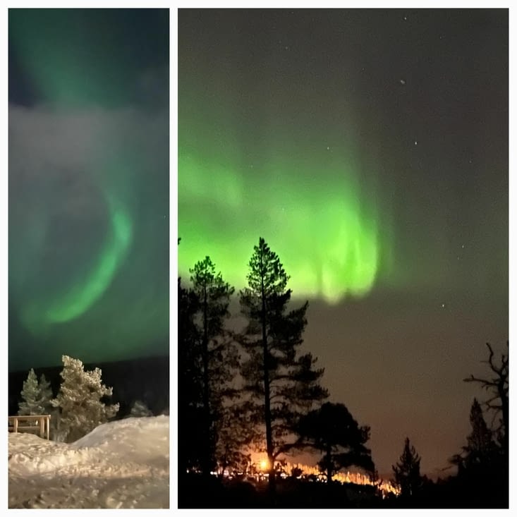Une soirée géniale, à 1 km de l'hôtel, après avoir arpenté des chemins enneigés en forêt nous avons observé de magnifiques aurores boréales.