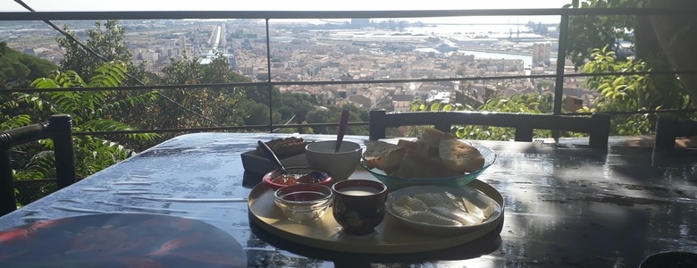 Ce matin le petit déjeuner nous attendait sur la jolie terrasse du jardin merveilleusement décoré et atypique de Fabienne et Serge, avec une vue magnifique sur Sète et toujours en compagnie de Holly très demandeuse de gratouilles.