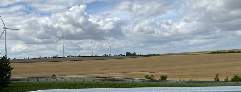 Sur plusieurs kilomètres dans la vallée de l’Aube il y a des champs d’éoliennes. C’est impressionnant. Et c’est vraiment très volumineux. Où qu’on regarde il y en a par groupe (en ligne).