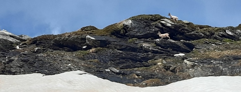J'arrive à l'usine...euh non-pardon au refuge du col de la Vanoise et commande une portion de frites et un café pour me réchauffer. Je descends ensuite à Pralognan-la-Vanoise, il y a en général beaucoup de monde sur ce secteur aujourd'hui ça va à-peu-près, nous sommes fin juin un mercredi. Les environs du lac long marquent la limite de la neige et j'arrive à l'emblématique lac des Vaches qui lui est dégelé.