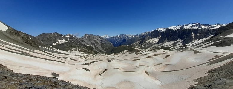 Arrivé après une dernière partie bien raide au col de Chavière, grand bleu aujourd'hui, la vue est splendide ! Au sud le département des Hautes-Alpes et les Écrins dont on distingue très bien le Dôme et la Barre. Au nord, tout le chemin déjà parcouru et le versant Italien du Mont-Blanc c'est superbe, belle récompense ! J'entame la descente tout schuss dans la neige et fait ma pause casse-croute au niveau du lac Vert en observant les marmottes.