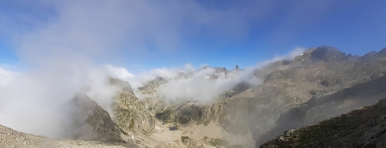 L'étape est assez courte sur le papier, on poussera certainement un peu plus loin. Le terrain est un peu technique avec la traversée de zones occupées par des pierriers et la dernière montée pour la baisse du Basto assez raide. Le col ou plutôt la baisse est dans les nuages, mais la vue s'ouvre par moments et laisse entrevoir un superbe point de vue.
