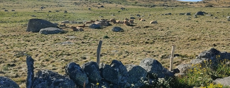 Des rochers partout, des champs, des vaches : pas de doute possible, c'est l'Aubrac !