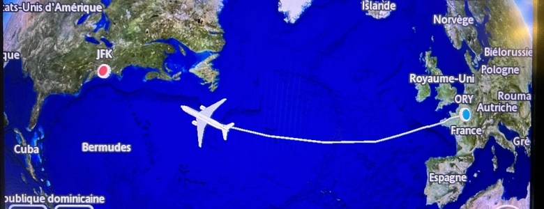 Train Strasbourg - Paris Massy, taxi Massy à Orly, avions d’Orly à JFK. Départ de la maison à 5h du matin, arrivée à l’hôtel à New York à 20h30 heure New yorkaise, donc 2h30 heure française…. Un petit tour à Times Square, et au lit après 24h