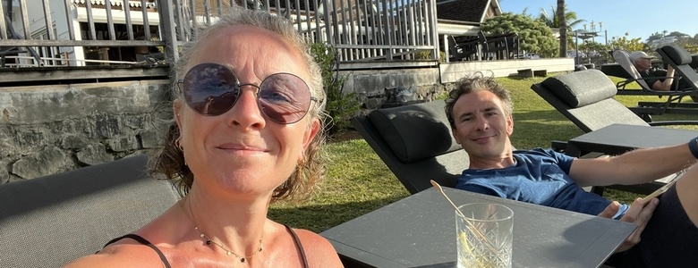 A l’arrivée nous sommes accueillis avec deux thés glacés. Nous profitons de la piscine et de la magnifique vue sur l’océan.
