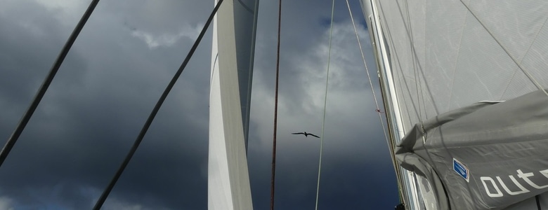 Pendant le grain. Nous avons atteint notre record de vitesse soit 17 noeuds. (Pour info notre vitesse de croisière est de 8-10 noeuds).