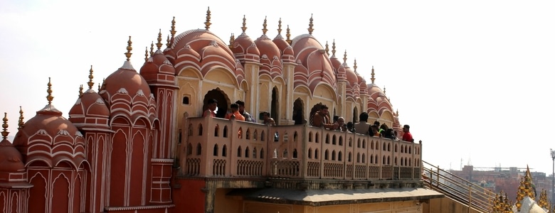Sur le toit terrasse on voit l'envers du décor de Jaïpur, en façade des maisons roses, derrière, des ruines et des ateliers d'artisans qui travaillent encore à la nuit et bien sûr des monceaux d'ordures.
