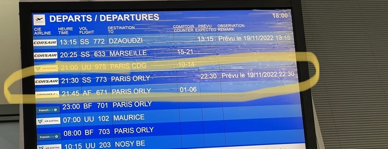 "En raison d'une contrainte opérationnelle, votre vol SS773 de ce jour est reporté: SS773 départ de la Réunion le 19/11/22 à 21h30.".