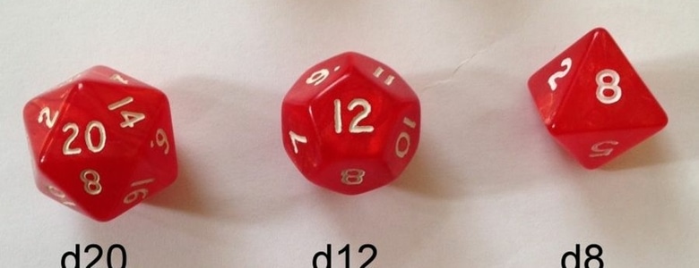 Donc, pour pimenter les actions, les joueurs lancent des dés. Il en existe 7 différents, ce qu'on appelle un set de dés. Le dé à 4, 6 (classique), 8, 10, 12, et 20 faces, Eh ! Y en a 6, me direz-vous ! C'est que le dé à 10 faces se déclinent en deux variantes : celle avec les unités (de 1 à 10) et les dizaines. En combinant les deux, on obtient un dé 100 (le résultat indiqué va de 1 à 100). Et voilà pour le 7ème. Pour ceux qui veulent en savoir plus, je vous invite à consulter cet article sur geek-it.
