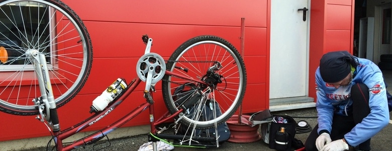 Après le petit-déjeuner, je pars chercher le ravito pour midi pendant que Pierre file chez le réparateur. Il fait environ 3°, mais le soleil est rayonnant. En 20 mn, la roue est réparée, la journée s’annonce bien. Nous décidons de raccourcir un peu pour arriver plus rapidement au Mont-Saint-Michel. Las, la roue nouvellement réparée semble déjà dégonflée. 1ère pause à une station service pour regonfler. Peine perdue, force est de constater quelques kilomètres plus tard qu’il y a bien à nouveau une crevaison… sur la roue qui vient d’être réparée. Après une nouvelle pause regonflage à la pompe, nous atteignons tant bien que mal Saint-Hilaire-du-Harcouët où Pierre peut effectuer la réparation et bénéficier du compresseur d’un gentil garagiste.