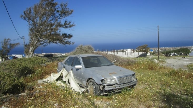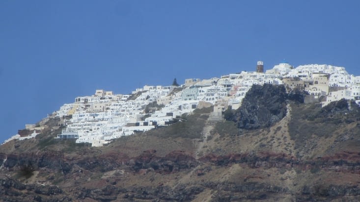 On se lève tard. On va voir si la voiture est OK. Les pneus semble correcte. On va prendre un café croissant, puis on retourne voir l'agence de location. Pas de problème. Bon, on marche jusqu’au port. On est presque devenue des habitués de la place. On deuxième café devant le quais. On est presque chum avec le serveur. Une belle traversée de 2 heures. Un peu l’anarchie pour Sortir. Beaucoup de monde. Je ne peux imaginer dans la saison haute. Un bus ou un taxi est nécessaire pour se rendre à la ville de Fira. La première impression n'est pas très bonne. On a de la difficulté de trouver l’hôtel. Il est loin du centre, pas de resto et en plus on se paye des côte. Le type semble idiot en plus. La chambre est super belle par contre. Pas de verre, pas de savon. pas de problème, j’ai mes réserves de savon. Une bonne brochette sur une terrasse avec vue sur la baie au coucher de soleil nous réconcilie avec Santorini. Beaucoup de ruelles avec magasin et resto. Une vrai trappe à touriste. A demain.