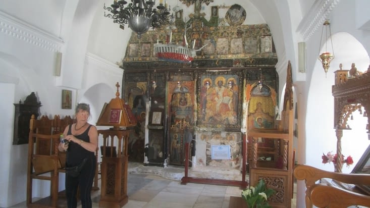 Après notre dėlicieux déjeuner nous louons une fiat 500, encore une fois, mais cabriolet. Nous partons pour différentes partie de l’île nous permettant d’apprécier les supers paysages. Nous en profitons pour 2-3 courtes randonnées, qui nous totalise une dizaines de km. On a visiter une ville médiévale percher sur un piton de roche (Kastro), avec des eaux turquoise comme toile de fond. Puis un monastère sur la plus haute montagne qui nous fait ventiler pas mal, mais nous donne une vue impressionnante. C'est vraiment une île ou les sentiers sont super bien identifier. Au retour, nous arrêtons dans un petit resto. Un hamburger pour moi qui se résume à une boulette de viande sur des épinards froids? On est arrivé juste au début de la noirceur. On est un peu fatigués mais très content de notre journée. A demain.