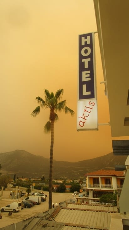 Nous trouvons une pâtisserie pour notre café et croissant. Wow un vrai décor de cinéma. Les boutiques sont design aussi. On remarche notre 3 km. Et prenons un taxi boat pour la ville de Galatas. Notre Capitaine Hadock avec sa mauvaise humeur grogne tout le long du parcours. 5 minutes plus tard, nous sommes sur le continent a Galatas. On essais de louer une voiture, pas de voiture! Trop tard pour le bateau pour Athènes. On fini par acheter un billet de bus. On retourne pour la voiture et finalement la demoiselle trouve une voiture un peu plus grosse mais qui est disponible pour une semaine et aujourd'hui. Wow quel chance. Nous partons pour le site archéologique d'Épidaure. Intéressant bien sûr, surtout le théâtre. Le chemin dans la montagne est superbe et beaucoup de verdure ici. Nous arrêtons à la ville d'Epidavros pour la soirée et le dodo. Belle petite ville balnéaire tranquille. Un phénomène bizarre arrive a l'heure du souper, le ciel devient jaune avec ce qui semble être une poussière jaune. Ça viendrait du désert du Sahara de l’Afrique. Réjean a trouver sa bouteille de vin favorite ce matin il en a acheté 2 et on le déguste sur le balcon de l’hôtel avec vu sur la mer et le ciel jaune, c'est surréaliste. A demain.