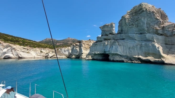 Passage devant Klima, un village de pêcheur, le cap Vani, halte à Kalogries, le trou de Sikia, baignade et brunch à Kleftiko, dernière halte devant l'église d'Agios Ioannis...