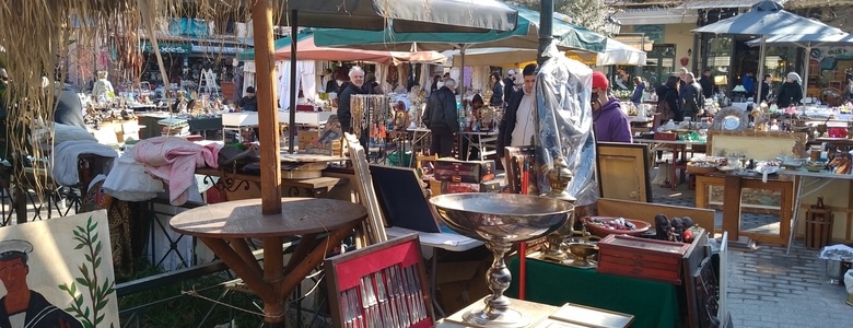 Pour y aller nous traversons à nouveau la place Omonia et passons par l hôtel de ville.Enfin, sur sa place, nous voyons nos premiers vestiges de l ancienne civilisation grecque et le résultat de fouilles archéologiques démarrées ici il y a une quarantaine d année...On en verra plein d autres un peu plus tard...Pour aller aux puces nous prenons des rues visiblement commerçantes pour les touristes...d ailleurs ceux ci sont plus nombreux de sortie en ce jour de grand ciel bleu , mais toujours frais.
