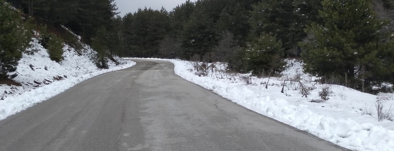 Nous attaquons ensuite la montagne et ses petites routes majoritairement impeccables,sauf glissements de terrain et il y en a pas mal.C est vrai que la Grèce a connu de grosses pluies et inondations ces dernières semaines...On passe quelques lacets, de plus en plus en fait,on monte, on monte, au loin les monts enneigées se rapprochent ( le plus haut du Péloponnèse, à 2400 m! ) Encore une fois, c'est vraiment une image de la Grèce que nous n avions pas : routes de montagnes, cols, neige...
