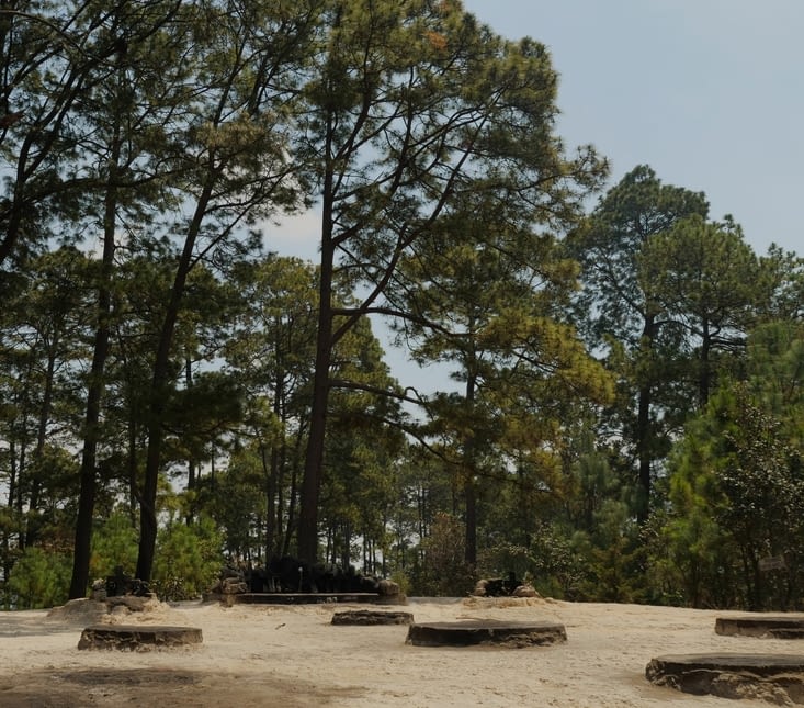 Le chemin vers Pascual Abaj part du musée. Il n'y a évidemment pas besoin de payer et les propriétaires indiquent avec plaisir la direction même sans payer le musée. C'est un petit chemin à travers une forêt clairsemée. En montant, des gens redescendait donc leur cérémonie était finie. En arrivant, il n'y avait donc pas grand chose de particulier. Une dame sur place nous expliqua les différentes significations des zones du lieu de culte. Le lieu est assez isolé de la ville. On peut donc avoir une belle vue sur la ville et son cimetière.