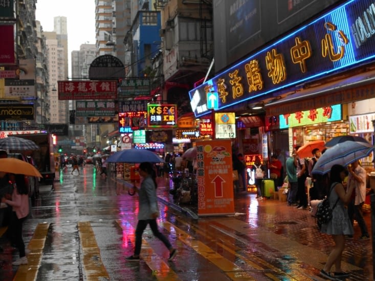 on traverse dans notre promenade le quartier le plus dense du monde 200 000 personnes par kilometre carré !!! des milliers de magasins en tout genre , des pancartes colorées... et si on leve les yeux la vie de quartier en vertical!!! du linge qui seche... des logements encore et encore....