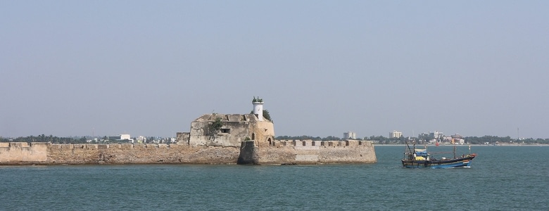 En sortant de l'église, je me dirige vers le fort de Diu. La vue sur la mer y est magnifique et le fort est immense et très intéressant. Il est en travaux de restauration. On y voit même une chapelle entourée d'échaffaudages, quelques canons pointés vers le large et un phare qui domine l'ensemble.