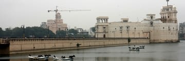 En me dirigeant vers la sortie, j'avise un petit train, chargé de visiteurs, arrêté près d'un escalier. Je grimpe les quelques marches et oh surprise, je vois une grande retenue d'eau bordée de charmants petits pavillons. Au loin, la vue est superbe sur le mont Girnar.