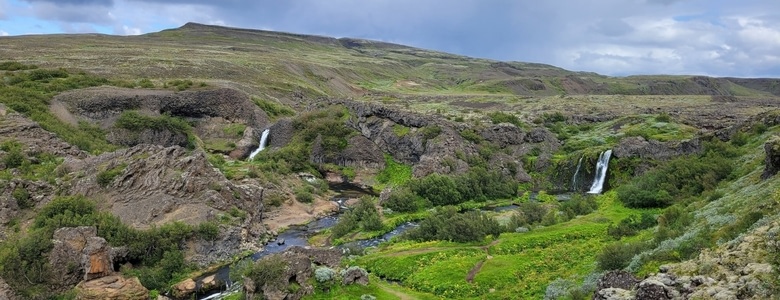 Après avoir été secoués dans tous les sens sur une piste pleine de cailloux, nous arrivons enfin à Gjain. C'est un joli vallon étrange et verdoyant. Les sentiers permettent de découvrir des formations volcaniques, des grottes et des jolies cascades et une même une petite île qui nous a servi de spot pour pique-niquer.