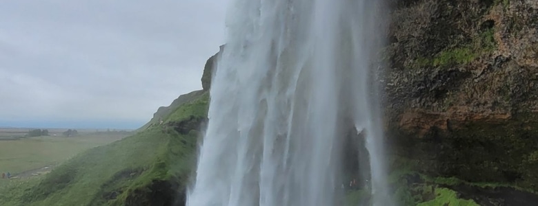 À Seljalandsfoss, un chemin nous amène derrière la cascade. Entre le vent, le débit et la chute de 60m de haut, douche garantie !
