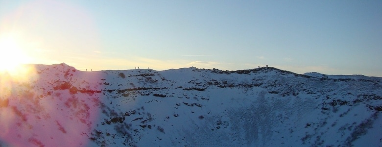 Nous commençons par aller admirer le lever de soleil sur le cratère de Kerið, une formation volcanique éteinte depuis longtemps. Au fond du cratère se trouve un lac, entièrement gelé en hiver. De façon surprenante (en Islande), la météo est excellente, et l'aurore est magnifique.