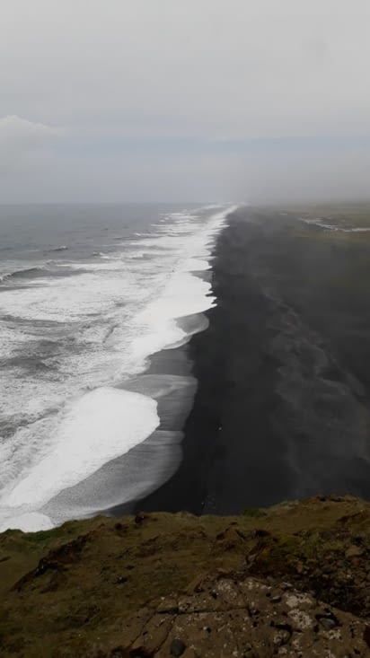 Vous arriverez sur une immense plage de sable noir. Un imposant bout de falaise en « orgue basaltique » abrite une petite caverne. Et au-dessus, des centaines de macareux qui nichent !! On peut les voir de très près. Certains volent au-dessus de nos têtes. Avec le vent on a vraiment l’impression qu’ils galèrent.