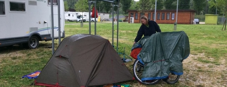 Après une vingtaine de kilomètres sur la route nationale, on prend des chemins et on se retrouve le long du canal, beaucoup de vent et pas une âme! Il est 19h et on n’a toujours pas trouvé de camping! Ouf! une personne qui promène son chien nous indique le camping à 5km, il faut traverser une zone industrielle, charmant! On arrive enfin et c’est juste un terrain avec des rangées de camping cars, on tombe sur un français qui a vécu 20 ans à Jougne, notre lieu de départ et le village de mes ancêtres! La pluie arrive, on a juste le temps de planter la tente et de manger des raviolis au saumon et c’est le déluge pendant toute la nuit!