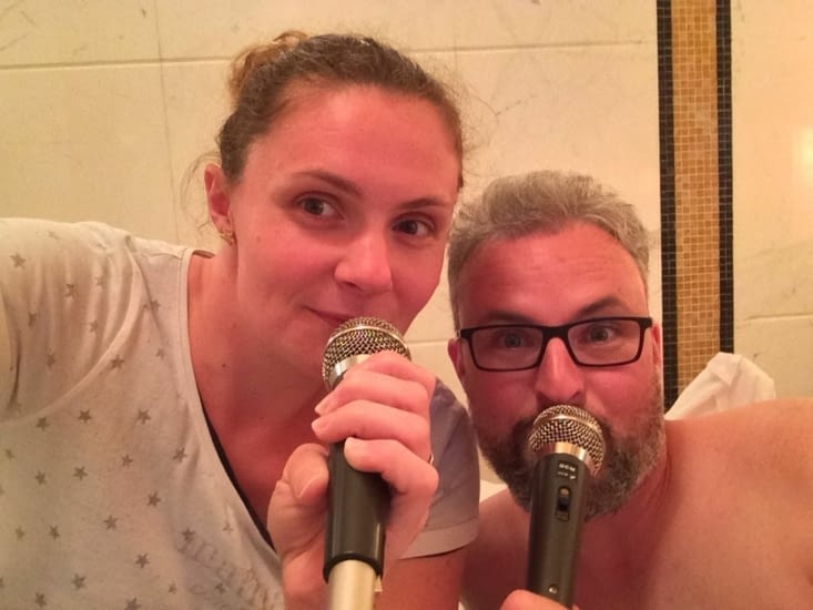 Avant de dormir scéance Karaoké ?!!! On a bien rigolé ? si il ń’y a pas de la neige ⛄️ demain on aura de la chance ? c’est que les notes ? n’auront pas été trop fausses!!!!