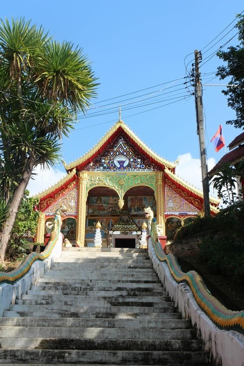 Juste en face de la guesthouse, un escalier monumental encadré par des Nagas, conduit au Vat Jom Khao Manilat, extrêmement coloré. Il fait très chaud et les chants religieux diffusés en permanence par haut parleur prennent un peu la tête. Je les entendais hier depuis la rive opposée. Je retourne à la guesthouse pour me reposer jusqu'à la fraîche.
