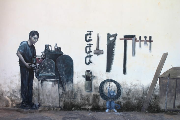 Une des choses que j'ai beaucoup aimées à Savannaketh, ce sont les murs peints qui représentent souvent l'activité des habitants de la maison. En voici quelques exemples.