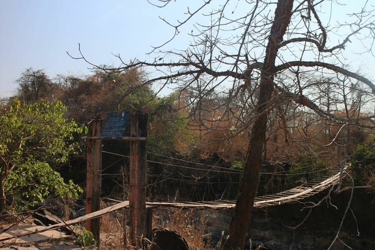 Mon projet de ce jour est d'aller visiter à vélo le côté Est de Don Khon, et notamment les cascades qui se trouvent au large d'un îlot relié à Don Khon par un pont suspendu. J'arrive rapidement à l'embranchement qui mène au pont. Un groupe de Français s'y trouve déjà, en arrêt devant un pont en fort mauvais état. Il manque la plus grande partie des planches transversales. un écriteau indique "bridge closed. Les autorités dégagent toute responsabilité en cas d'accident." Dommage ! Tout le monde renonce à traverser.