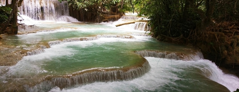 L'après midi nous prenons un mini-van pour aller à une magnifique cascade à 1h de route (Kuangsi Waterfall). Elle se compose de plusieurs bassin d'eau où l'on peut se baigner. L'eau était bleue turquoise dûe à sa teneur en calcium (provenant de la roche calcaire). Nous empruntons un chemin escarpé pour accéder au sommet des chutes, et faisons une petite marche dans la forêt avant de redescendre et nous baigner.