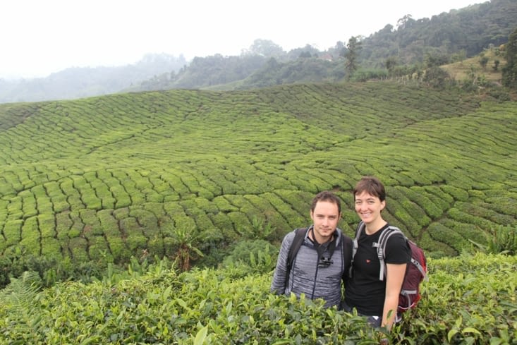 A la sortie de Kuala Lumpur, les champs de palmiers à huile s'étendent à perte de vue. La route tourne beaucoup. Le bus klaxonne à tous les virages. Et nous apercevons enfin les premiers champs de thé.