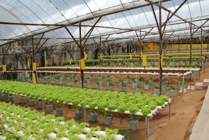 De l'autre côté de la route, en contre bas, nous apercevons les fermes de cresson. Mais nous n'aurons pas l'occasion de voir le cresson de plus près. Le guide nous explique que la nature sauvage qui paraît intacte au alentour des plantations est en fait une supercherie. Vue d'hélicoptère le paysage est entièrement dévasté par les plantations humaines, notamment l'huile de palme.