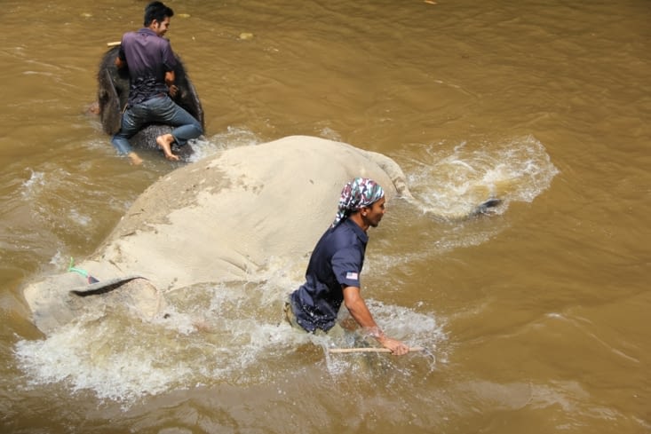 Il y a ensuite un petit "spectacle" pour présenter les éléphants qui font la courbette, beaucoup moins intéressant à notre goût (nous ne sommes pas dans un cirque !). Puis nous leur donnons des pastèques.Bain avec un petit éléphant qui fera caca sur Alex. Un des soigneurs lui dit : "poupou éléphant".