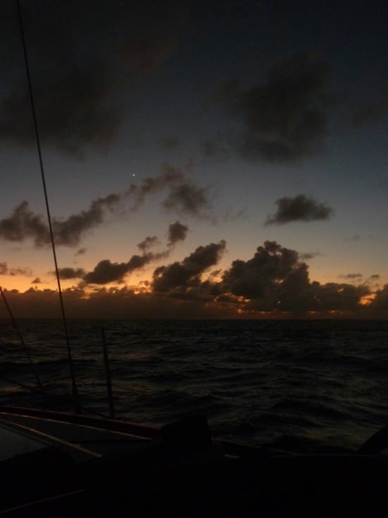 La première aurore résonne comme un miracle. Au milieu de l'océan, nous apercevons déjà Maurice au loin très loin, et nous berçons dans les lumières magiques du mini matin.