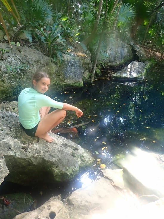 Nous sommes allés au cenote Azul. Il est grand mais pas profond, il y a plein de poissons, ils te mangent les pieds et surtout nos bobos alors il faut toujours cet endroit pour ne pas qu'ils te fassent mal. L'eau était un peu froid, à la fin de la baignade papa a trouvé un trou à la surface de l eau, juste de quoi passer la tête et sous l'eau le trou faisait 1m de profond sur moins d'1m de large. Moi je suis passée sous l'eau alors que maman a préféré rentrer par le petit passage en surface.