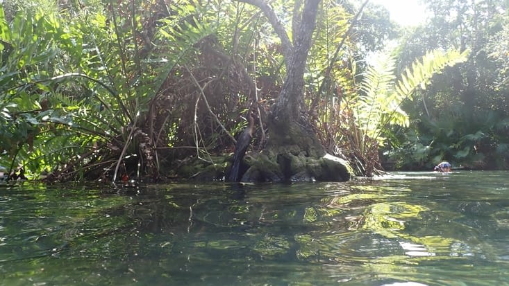 Il y a plein de petits cenotes autour des deux grands bassins, ils avaient chacun une couleur bleu différente, et des poissons différent et parfois un peu moches, des poissons chats, des petits qui mangent les pieds, des poissons avec une nageoire du dessus qui se déploie comme un voile piquant. Il y a des endroits où tu n'as pas pieds et d'autres où il y a des rochers rugueux ou très glissants qui peuvent facilement t'éclater les orteils, les genoux ou les mains ! Tout est relié par un petit chemin qui te permet de tout découvrir, il y a même un endroit d'où tu peux sauter mais c'était haut, environ 4m, du coup je ne l'ai pas fait. Papa a dit qu'il le ferait mais...il ne l'a pas fait finalement...hihi peureux !Nous avons vu un drôle de poisson rapide, d'ailleurs se poisson n'en est pas un mais plutôt un genre de poisson, oiseau, girafe ! Il a un cou tellement souple qu'il s'enroule sur lui même puis part gratter ses fesses !!