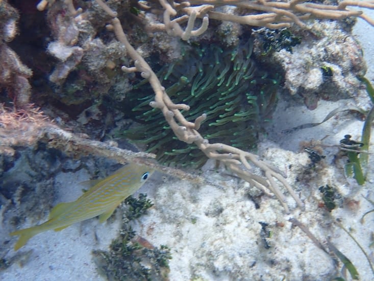 Nous avons vu beaucoup de coraux différents, et des poissons de toutes les sortes, des anémones, des gros baracoudas aussi et des petits crabes.