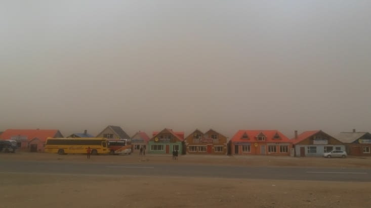 Le bus fait du surbooking. Quand il n`y a plus de place, on jette un baluchon dans l`allee et le dernier arrive doit faire avec. J`ai echange ma place avec cette maman et son bebe et voyage quelques heures sur le baluchon. Mon jeune voisin tres sympa (un poete de 18 ans) a pris le relais. Nous avons donc fini le voyage ensemble et elle m` a gentiment propose de m`accompagner dans un hotel a l`arrivee. Effectivement son mari l`attendait dans une grosse voiture. Le temps qu`elle transporte les enfants, et les bagages du car a la voiture, l'homme n`a pas bouge de son siege ( d`apres Brieuc, la societe mongole est une societe machiste). Par contre, il a tres bien negocie le prix a l`hotel. Chacun son job ! Comment avons nous pu communiquer ? C`est simple, j`ai bien ete obligee d`apprendre le mongol...