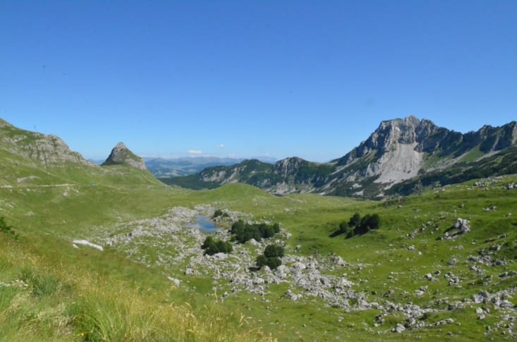 Après un réveil monténégrin hier, nous avons opté pour un bon réveil à la française ce matin. Levée à 12h, Corn-flakes à 13h, départ à 14h ! Après une magnifique route le long de la Tara, nous arrivons à l’évènement national de la rivière ; un grand pont en béton datant de l’après-guerre. De part et d’autre de la rivière sont installées des grandes tyroliennes (ZipLine) où se pressent tous les touristes. Après une petite photo, nous reprenons la route vers le plateau de Zabjlak. Zabjlak est le camp de base du parc national Durmitor qui comprend notamment deux très beaux lacs glacières (The Black Lake : the small and the big). Nous arrivons dans un immense plateau ressemblant un peu à celui du Vercors. Nous nous en mettons plein les mirettes et nous salivons déjà à l’idée d’y rester trois jours. Le grand défi de l’après-midi, il est déjà 17h, est de faire le tour des deux lacs. Nous arrivons à filouter en passant par un camping pour éviter les 3€ d’entrée au parc. Les deux lacs sont vraiment magnifiques, entourés par des forêts de conifères et surplombés par les montagnes qui culminent à 2500m. Jean se risque même à une petite baignade, sans grand frisson car l’eau est à 17°C. Petite tour fait, nous regagnons Titine et cherchons un coin pour la nuit. Comme d’habitude, nous nous retrouvons dans des chemins de pierre. Mais par miracle, pas besoin de faire demi-tour cette fois-ci car au bout de la route un super spot dodo nous attend !