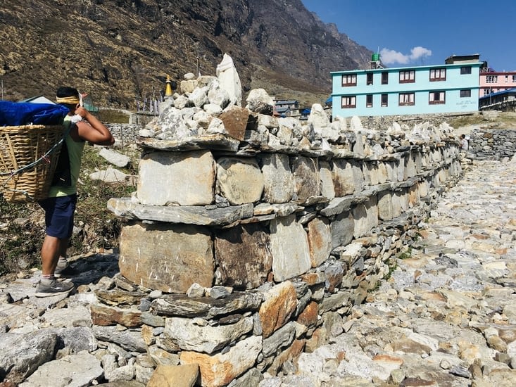 26 avril, on quitte Langtang pour SherpaGaon. On connaît le chemin jusqu’à Rimche mais c’est pas pareil de le faire dans l’autre sens. On croise encore des trekers, certains ont des porteurs qui ploient sous des charges impressionnantes. Mais qu’est-ce qu’il y a dans leurs sacs pour qu’ils soient autant volumineux ?