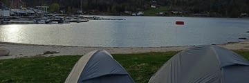 Trop marrant ! Le camping est a 300m, on arrive, et paf ! La claque, couché de soleil, magnifique. Nous sommes (encore) les seuls en tente. Il ne fait pas chaud, mais la nuit va être bonne, on dors toujours bien l'estomac plein ! Demain, une looongue journée nous attend... Dodo.